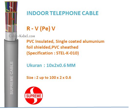*Harga Hubungi CSKABEL TELEPON INDOOR CABLE R – V (Pe) V PVC Insulated, Single coated alumunium foil shielded, PVC sheathed (Specification : STEL-K-010) Ukuran : 10 x 2 x 0.6 MM Brand : SUPREME Size : 2 up to 100 x 2 x 0.6 mm